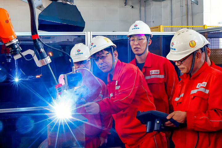 2025年4月29日,在海油工程天津智能化制造基地,劉海林(左二)和同事調(diào)試一臺焊接機器人。