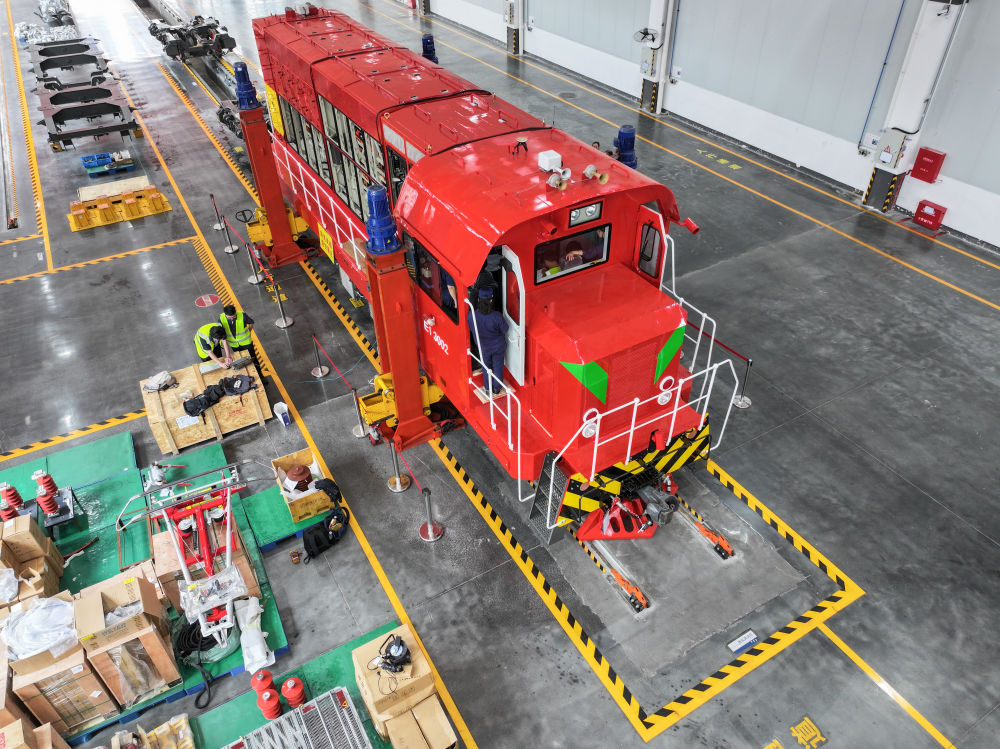 這是4月26日在湖南株洲聯(lián)誠集團控股股份有限公司新產(chǎn)業(yè)事業(yè)部車間拍攝的一臺準(zhǔn)備改造成新能源的機車(無人機照片)。新華社記者 陳澤國 攝