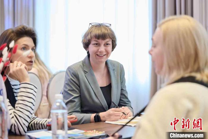2025年3月,安娜斯塔西婭(左二)在莫斯科參加海南文旅推廣活動,與當地旅行商交流。(受訪者 供圖)