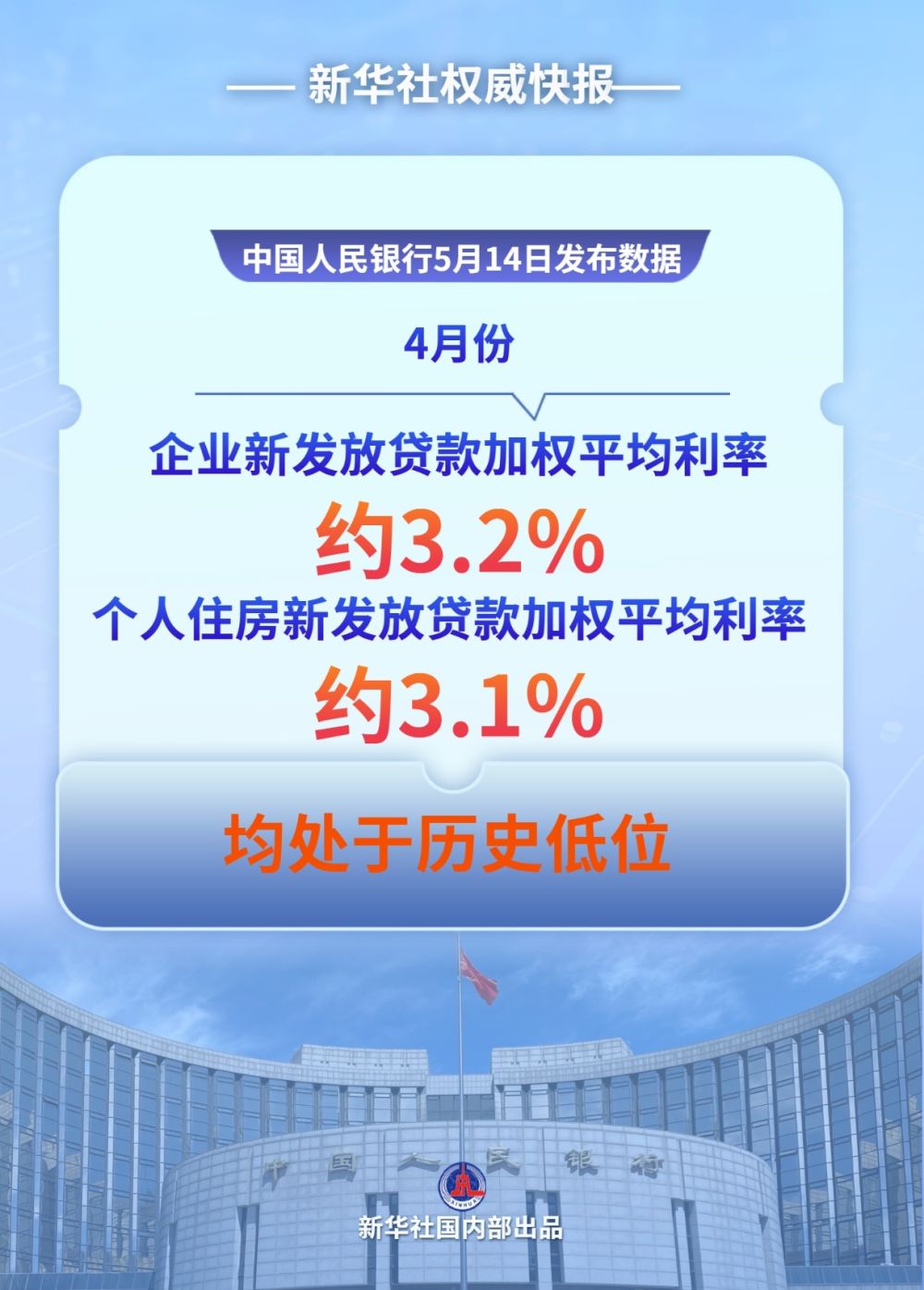 中國人民銀行的數(shù)據(jù)顯示,4月份,企業(yè)新發(fā)放貸款加權(quán)平均利率約3.2%,比上年同期低約50個(gè)基點(diǎn);個(gè)人住房新發(fā)放貸款加權(quán)平均利率約3.1%,比上年同期低約55個(gè)基點(diǎn),均處于歷史低位。