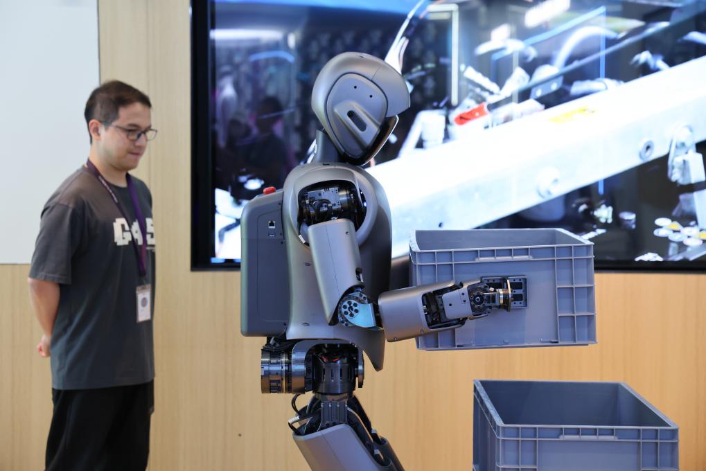 4月23日,在深圳優(yōu)必選科技展廳內(nèi),工業(yè)人形機器人Walker S演示搬運物品。新華社記者 梁旭 攝