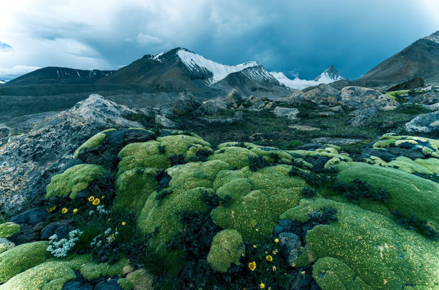 第二天一早,我們繼續(xù)向山脈的腹地去探索,前往冷布崗日腹地的道路也是無(wú)人踏足的,沒(méi)有正規(guī)車道的,所以我們同樣只能沿著牧民留下的車轍印前行。在一望無(wú)際的高原上,我們找不到路的時(shí)候就操縱無(wú)人機(jī)升空去探索路線。經(jīng)過(guò)了一整天的艱難探索,終于抵達(dá)了目的地,這個(gè)地方再往上走是完全沒(méi)有路了。在海拔約5800米左右的這個(gè)地方,不僅有巍峨壯美的雪山,還長(zhǎng)著很多這種獨(dú)特的高山苔蘚,這種植被通常只分布在海拔4000米以上的地區(qū),極具地域特色。所以在拍攝時(shí),我將這些高原特有的植被作為前景,既展現(xiàn)了高原生態(tài)風(fēng)貌,也作為海拔高度的天然標(biāo)識(shí),然后遠(yuǎn)處雄偉的冷布崗日雪山則構(gòu)成了畫(huà)面的核心部分。