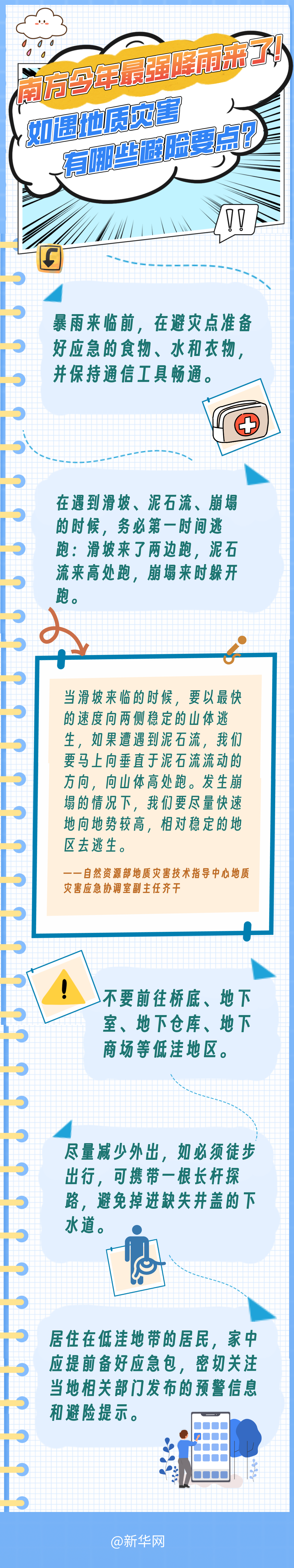 中央氣象臺(tái)消息,預(yù)計(jì)5月27日至29日,我國(guó)南方將出現(xiàn)今年以來(lái)最強(qiáng)降雨過(guò)程,并與前期強(qiáng)降雨區(qū)高度疊加,暴雨災(zāi)害風(fēng)險(xiǎn)高。新一輪強(qiáng)降雨過(guò)程范圍廣、累計(jì)降水量大,地質(zhì)災(zāi)害風(fēng)險(xiǎn)不容忽視。強(qiáng)降雨可能引發(fā)哪些地質(zhì)災(zāi)害?地質(zhì)災(zāi)害發(fā)生前,有哪些征兆?如遇地質(zhì)災(zāi)害,有哪些避險(xiǎn)要點(diǎn)?