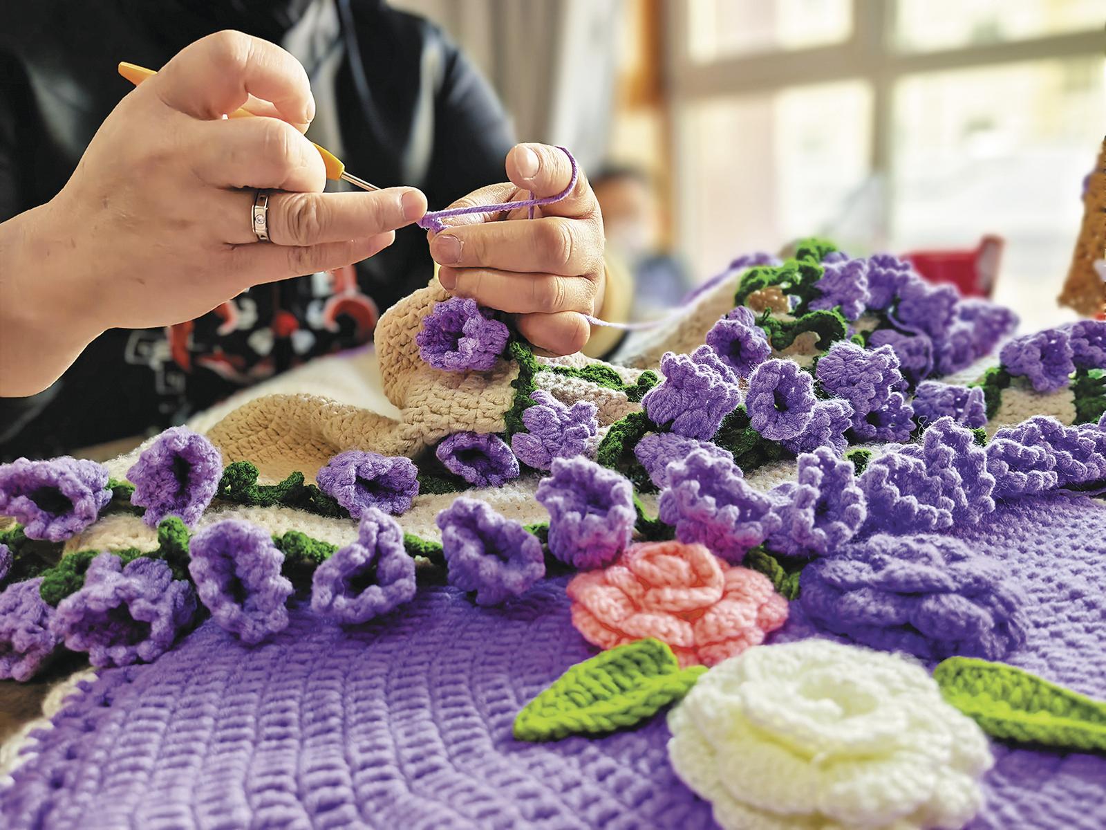 找到了目標(biāo)就馬上行動(dòng),蓋毯、杯墊、發(fā)箍,玫瑰花、郁金香、鈴蘭花……各種花型的各類產(chǎn)品經(jīng)過(guò)她的一雙巧手被“創(chuàng)造”出來(lái),成為工作室里最吸睛的“裝飾”,也吸引不少群眾前來(lái)“拜師學(xué)藝”。
