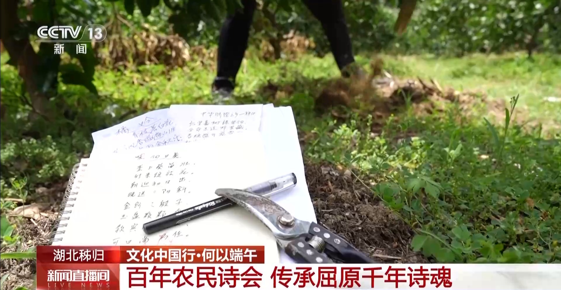 承襲千年詩(shī)風(fēng),傳承屈原精神,詩(shī)社成員不僅吟唱詩(shī)歌,還作詩(shī)。對(duì)于這些農(nóng)民詩(shī)人們來說,每天一手鋤頭、一手詩(shī)歌,是大家平日的寫照。今年75歲的黃家兆,60歲時(shí)加入詩(shī)社,并學(xué)習(xí)作詩(shī)。僅靠著老社員的口授,初中文化的他硬是背下了百余個(gè)詩(shī)詞格律。有時(shí)在田間靈感來了,順手撿來的廢紙都可以成為他寫詩(shī)的地方。十幾年來,黃家兆共創(chuàng)作了一百二十多首詩(shī)歌。田間的橙子,林中的啄木鳥,四季的勞作,豐收的時(shí)刻,一首首詩(shī)歌記錄著恬靜的歲月,更記錄著為美好生活的奮斗。
