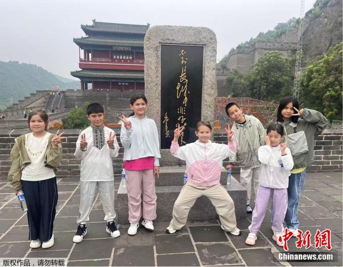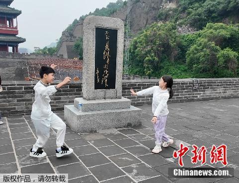 6月1日,來自新疆和田市的孩子們?cè)诰佑龟P(guān)長城。中新網(wǎng)記者 管娜 攝