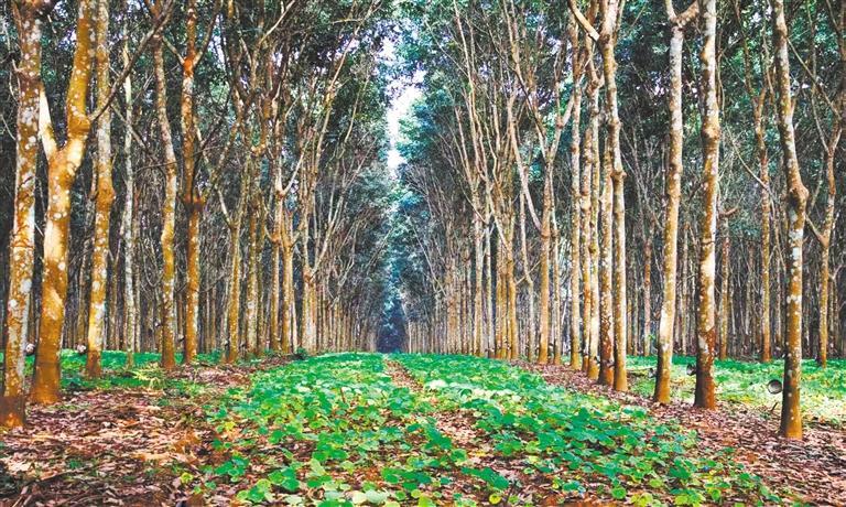 在距離西雙版納傣族自治州景洪市環(huán)城北路約1公里處,記者見到云南省熱帶作物科學(xué)研究所占地1054畝的環(huán)境友好型生態(tài)膠園千畝試驗示范基地。這里將橡膠樹種植行距從傳統(tǒng)8米擴(kuò)大到20米以上,在橡膠樹間套種上述經(jīng)濟(jì)作物。如此布局,即使橡膠行情不好,經(jīng)過精心篩選套種的其他經(jīng)濟(jì)作物也能取得不錯的經(jīng)濟(jì)效益。