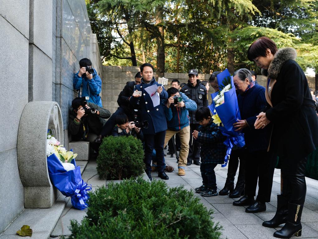 ↑2016年12月3日,夏淑琴(右二)和家人在侵華日軍南京大屠殺遇難同胞紀(jì)念館向遇難者獻(xiàn)花。