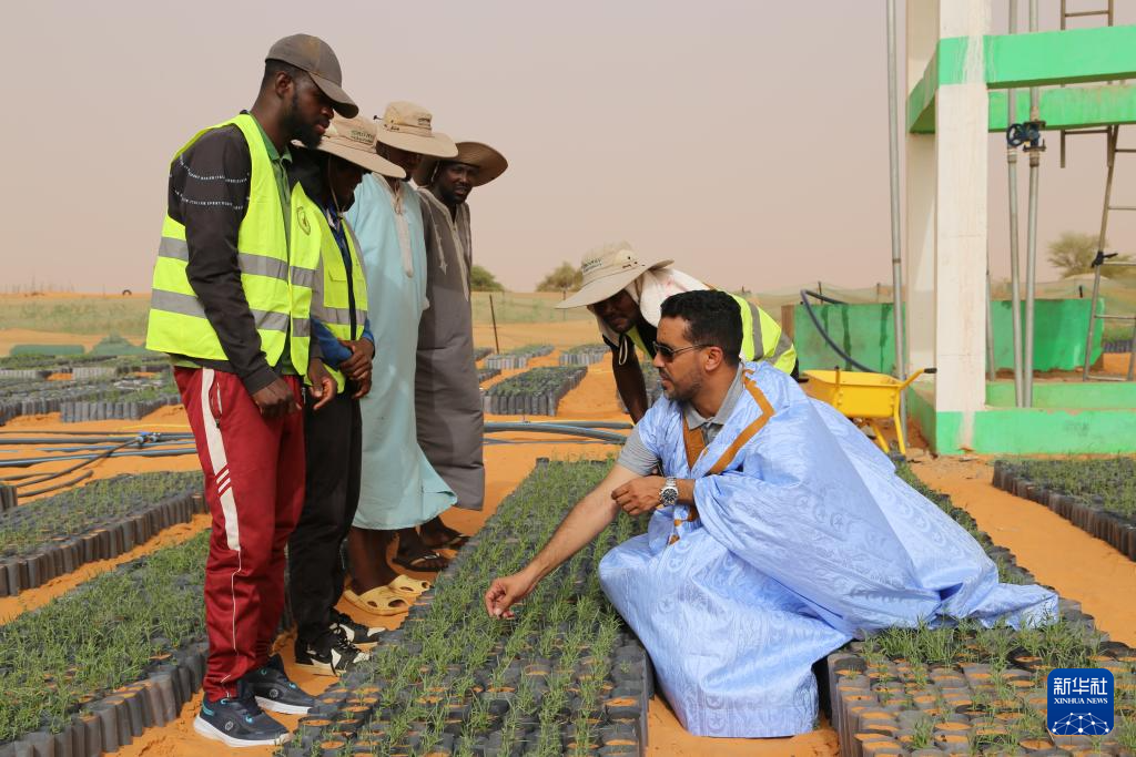 5月22日,在毛里塔尼亞西部特拉扎區(qū)比爾·巴爾卡村,中非綠色技術(shù)公園毛里塔尼亞示范項(xiàng)目毛方協(xié)調(diào)員圖拉德·邁杜向工人傳授固沙植物種植技術(shù)。新華社記者 司源 攝