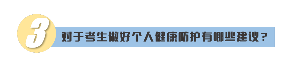 考生要做好個(gè)人防護(hù),當(dāng)好自身健康第一責(zé)任人??记氨M量減少聚集和流動(dòng),不去人員密集場所。同時(shí),調(diào)整好心理狀態(tài),保證合理的飲食、充足的睡眠、適當(dāng)?shù)纳眢w鍛煉,如有不適,要及時(shí)就醫(yī)治療,謹(jǐn)防因身體不適而影響考試。對于發(fā)熱或者突發(fā)急病等考生,也不必?fù)?dān)心恐慌,各地考點(diǎn)都制定了相應(yīng)的預(yù)案。