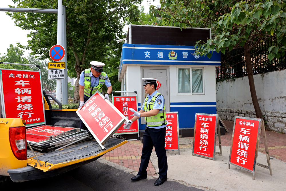 6月6日,山東省棗莊市公安局市中分局交警大隊輔警把高考期間道路交通管制標志牌運送到各考點執(zhí)勤崗。新華社發(fā)(孫中喆 攝)