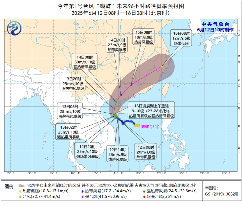 根據(jù)預(yù)報(bào)路徑,“蝴蝶”在海南島沿海首次登陸后,可能于14日白天在廣東西部到廣西沿海再次登陸,屆時強(qiáng)度仍將維持在強(qiáng)熱帶風(fēng)暴級,登陸后轉(zhuǎn)向東北方向移動,強(qiáng)度逐漸減弱。