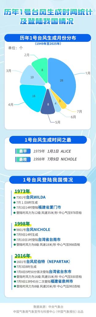 氣象上通常將當(dāng)年西北太平洋及南海生成的首個編號臺風(fēng)稱為“初臺”。統(tǒng)計(jì)顯示,每年1號臺風(fēng)生成的時間分散在1月至7月。1979年的“初臺”在元旦當(dāng)天就生成了,而1998年的“初臺”則直到7月9日才出現(xiàn)。常年平均“初臺”生成時間為3月25日,從這個角度看,今年第一個臺風(fēng)有點(diǎn)姍姍來遲了。