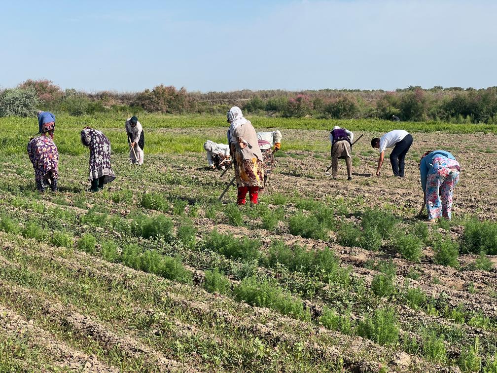 6月3日,位于烏茲別克斯坦穆伊納克鎮(zhèn)的咸海國際創(chuàng)新中心的試驗示范園區(qū)內(nèi),當?shù)剞r(nóng)戶在與中國科學院新疆生態(tài)與地理研究所合作共建的“光伏+生態(tài)”鹽生植物園里勞作。(受訪者供圖)