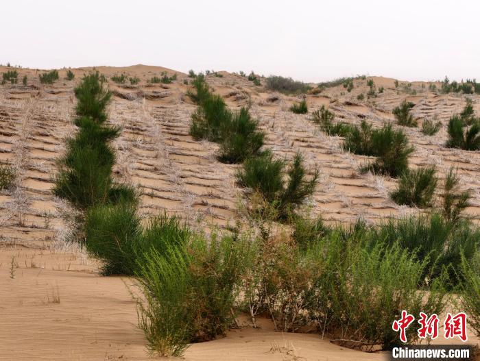 夏日驕陽(yáng)炙烤著九棵樹治沙項(xiàng)目區(qū),廣袤的沙地上,一排排整齊的草方格如同給沙丘上了“鎖鏈”,而這些被固定住的流沙,為植被生長(zhǎng)創(chuàng)造了重要條件。