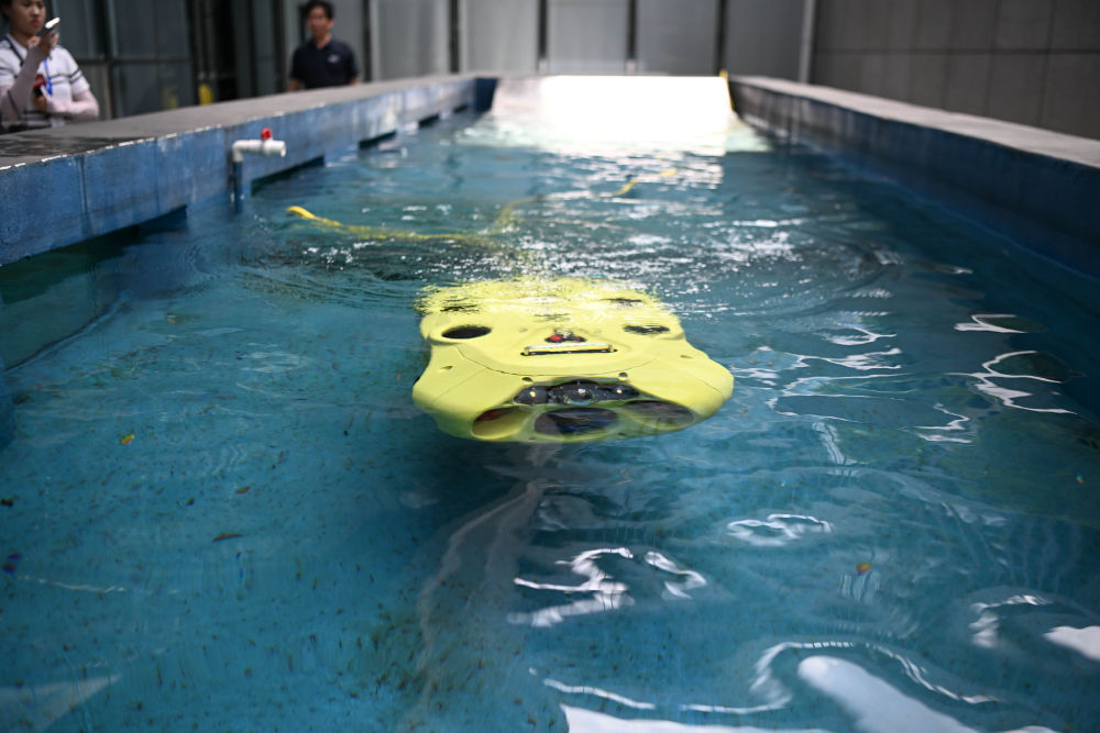 在長方形的測試水池里,一臺(tái)明黃色的“鐵疙瘩”時(shí)而浮出水面,時(shí)而沉入水底,看似笨重的身軀卻靈活得仿佛一條游動(dòng)的魚。這款用于水下檢測的智能機(jī)器人,可以在“一沉一浮”間實(shí)現(xiàn)對(duì)水下情況全方位、無死角的探測作業(yè)。