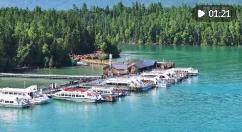 在碧波蕩漾的新疆喀納斯湖里,一艘艘全電觀光游船正載著游客欣賞著這里獨(dú)特的湖光山色。