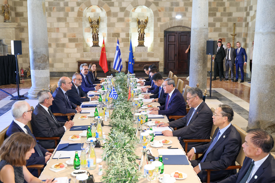 當(dāng)?shù)貢r間7月4日下午,國務(wù)院總理李強在希臘羅德島會見希臘副總理哈齊達基斯。新華社記者 劉彬 攝