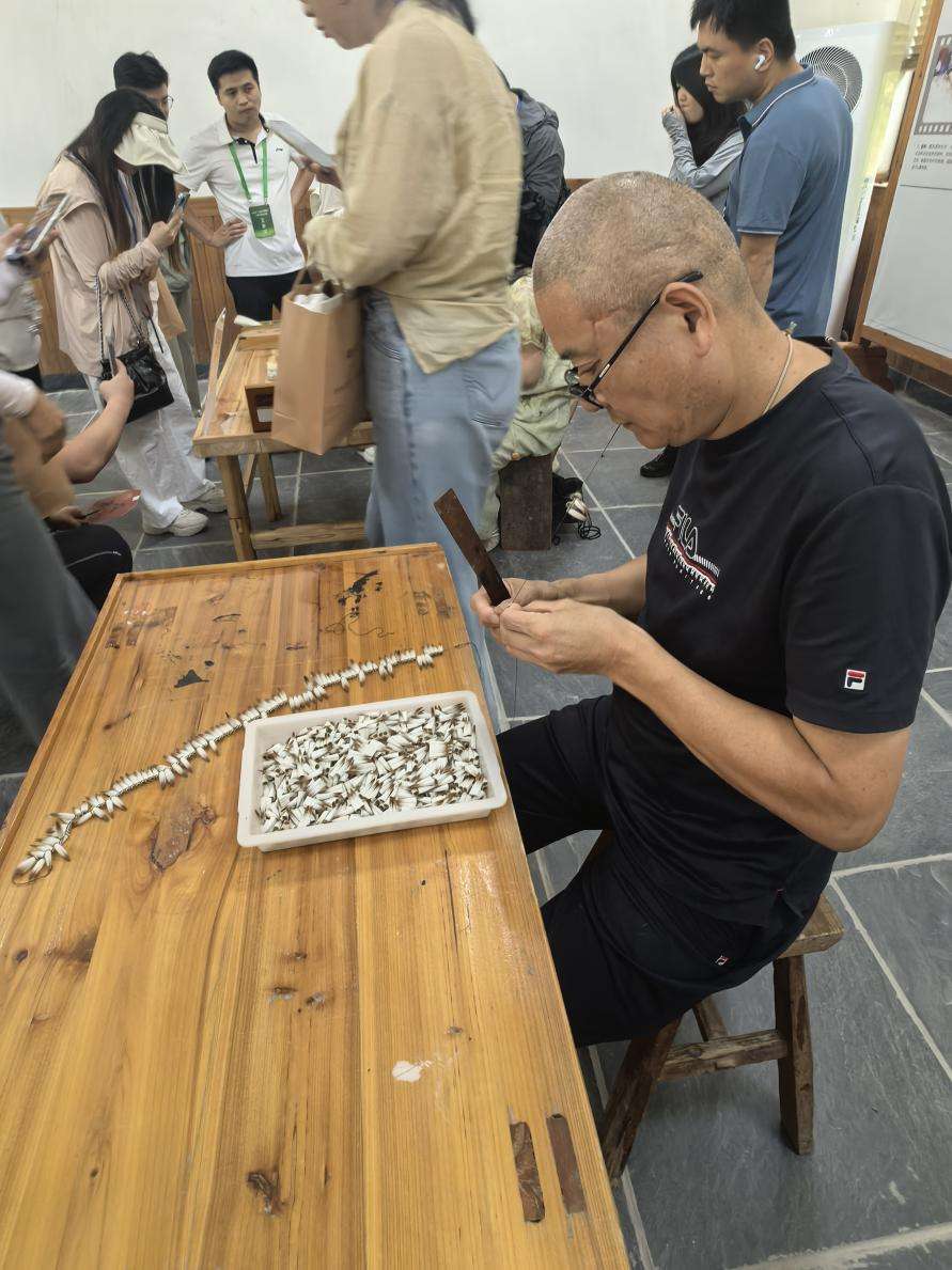在博物館的體驗區(qū)域,幾位制筆匠人正現(xiàn)場演示毛筆制作的各工藝環(huán)節(jié)。市級非物質(zhì)文化遺產(chǎn)項目代表性傳承人周平正咬著線的一端,兩手飛快地纏綁筆頭,這是制筆過程的“綁筆”環(huán)節(jié)。周平的徒弟李啟富在一旁認(rèn)真觀看,將師父的每一個動作記在心里。