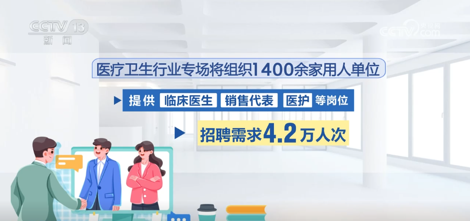 醫(yī)療衛(wèi)生行業(yè)專場(chǎng)將組織1400余家用人單位,提供臨床醫(yī)生、銷售代表、醫(yī)護(hù)等崗位,招聘需求4.2萬人次。