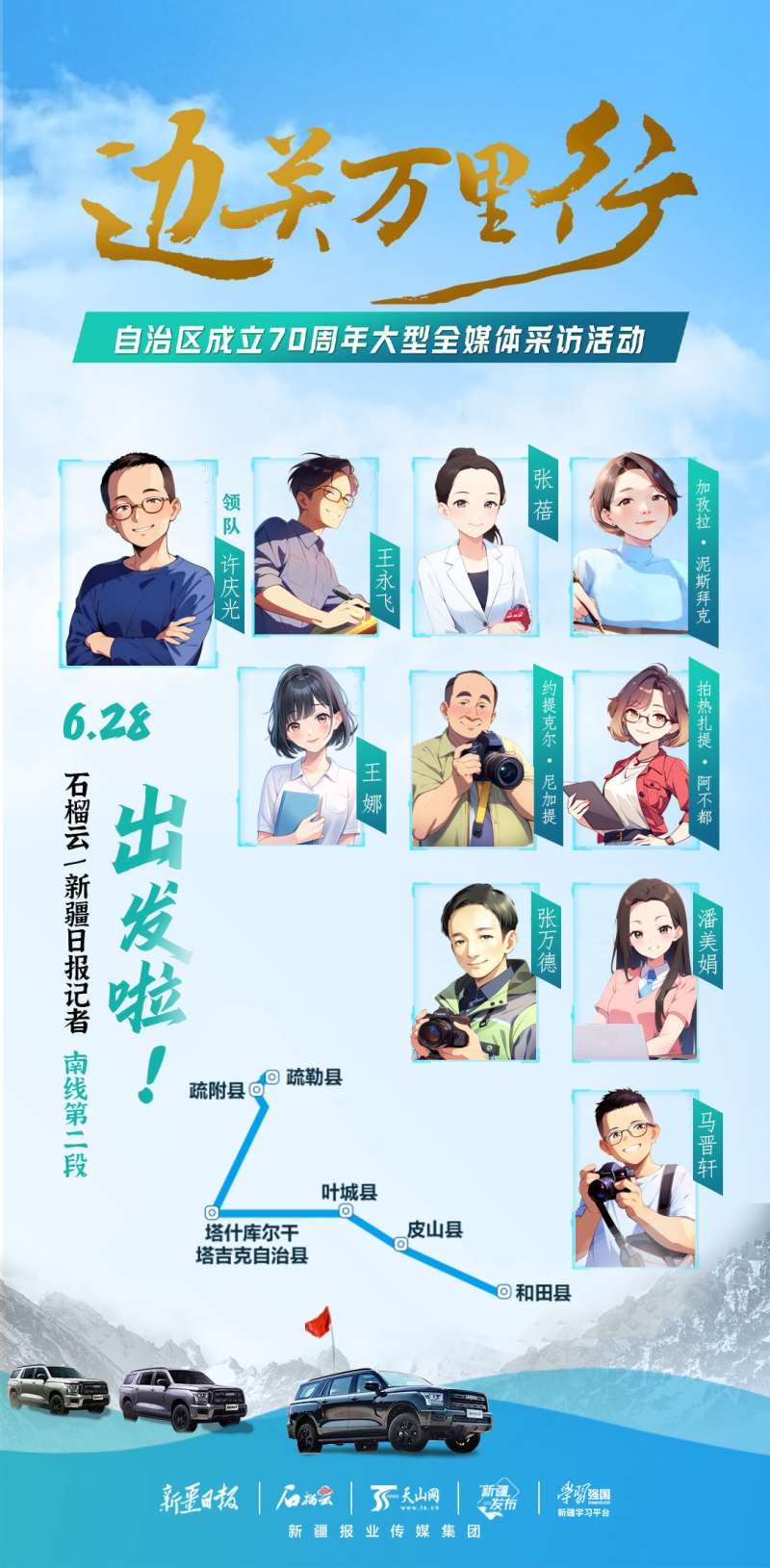 從6月29日開始,“邊關(guān)萬里行——自治區(qū)成立70周年大型全媒體采訪活動”南線采訪團隊先后前往喀什市、疏附縣、疏勒縣、伽師縣、塔什庫爾干塔吉克自治縣、葉城縣等地進行采訪。從喀什古城到農(nóng)家小院,從城區(qū)到工業(yè)園區(qū),從邊境派出所到紅其拉甫國門……記者們一直在路上記錄70年來的發(fā)展變遷。