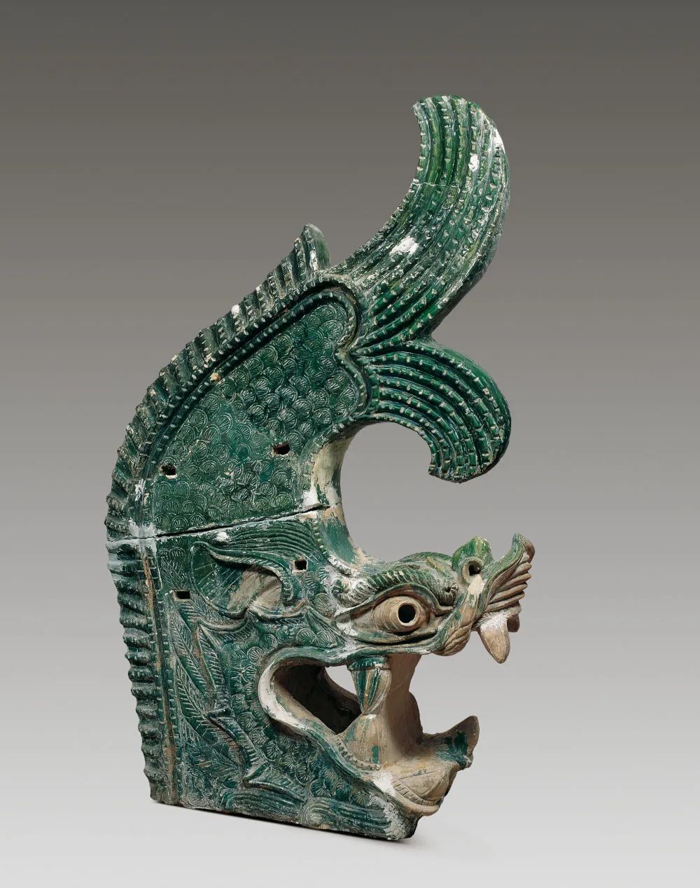 在中國(guó)國(guó)家博物館“古代中國(guó)”基本陳列上,一件出土于西夏陵6號(hào)陵的綠釉鴟吻十分顯眼。作為西夏陵的一個(gè)建筑構(gòu)件,它形體高大,既與同時(shí)期中原地區(qū)的鴟吻相似,又具有龍頭比例更大、魚(yú)尾分叉等方面的獨(dú)創(chuàng)性。