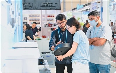 4月16日,客商在廣交會(huì)上了解掃地機(jī)器人產(chǎn)品。新華社記者 盧漢欣攝