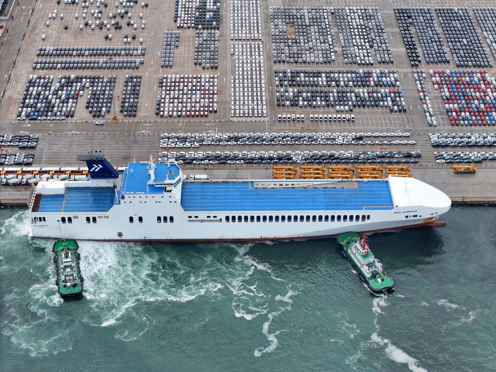 6月29日,汽車運輸船停靠山東港口煙臺港,準備裝運出口汽車(無人機照片)。新華社發(fā)(唐克 攝)