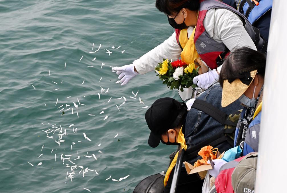 2024年3月28日,山東青島眾多生態(tài)海葬逝者的親屬乘船出海參加海上追思活動(dòng)。新華社記者 李紫恒 攝