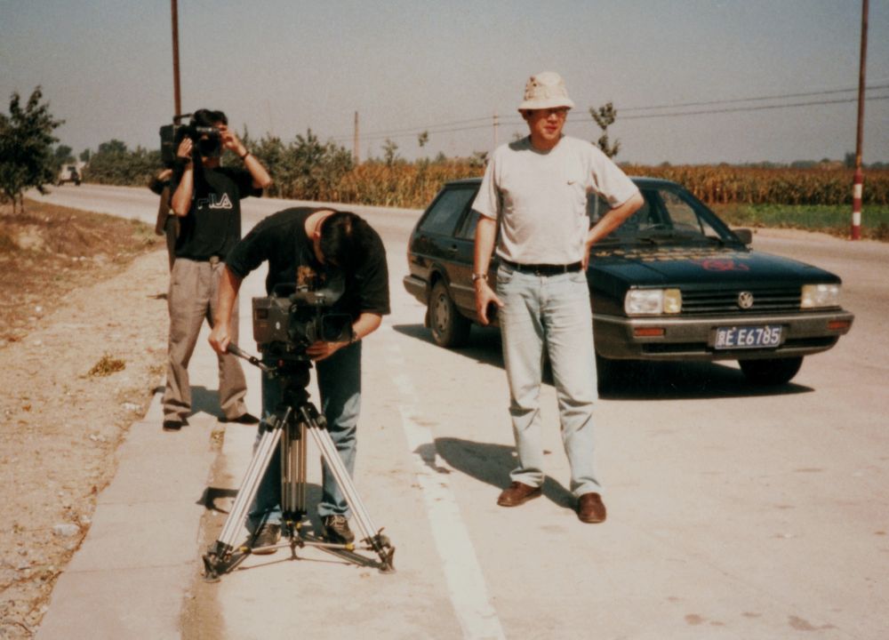 馮雪松(右)和攝制組在保定當年的戰(zhàn)地尋訪。孫進柱 攝