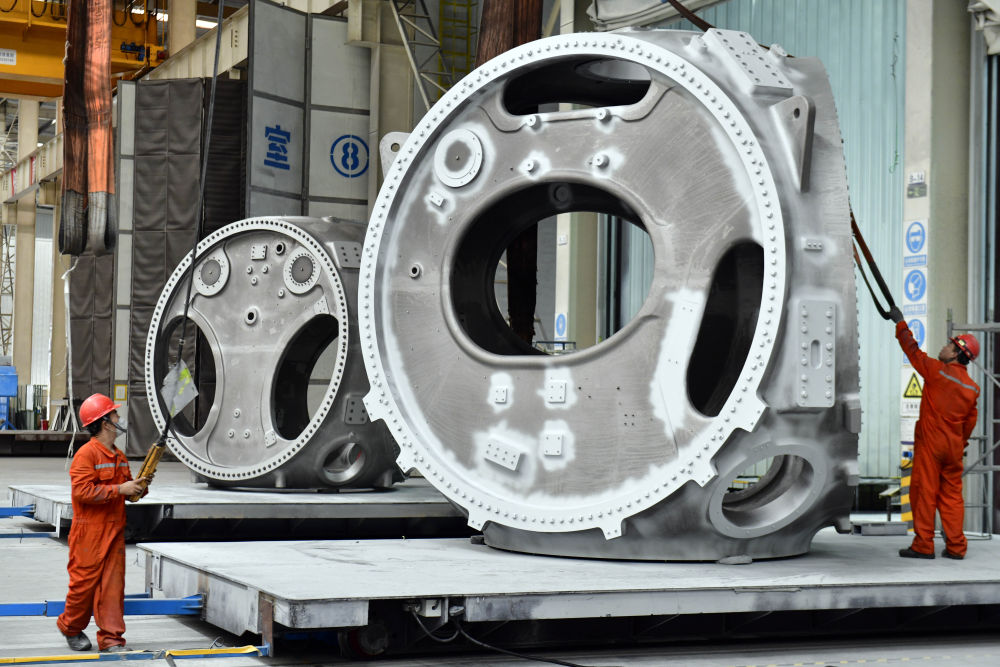 在位于山東省濱州市惠民縣的山東國(guó)創(chuàng)精密機(jī)械有限公司,工作人員在對(duì)風(fēng)電輪轂進(jìn)行噴涂作業(yè)。新華社記者郭緒雷 攝
