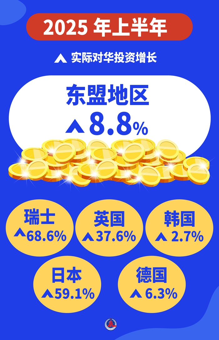 開放合作是歷史潮流,互利共贏是人心所向。今年上半年,東盟地區(qū)實(shí)際對(duì)華投資增長(zhǎng)8.8%,瑞士、日本、英國(guó)、德國(guó)、韓國(guó)實(shí)際對(duì)華投資分別增長(zhǎng)68.6%、59.1%、37.6%、6.3%、2.7%。