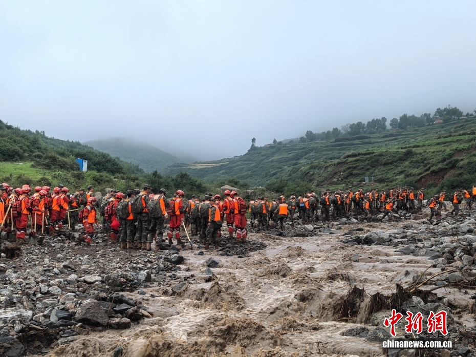8月8日,武警甘肅總隊機(jī)動支隊官兵挺進(jìn)災(zāi)區(qū)甘肅省蘭州市榆中縣馬坡鄉(xiāng)舊莊溝村展開救援。劉昆 攝