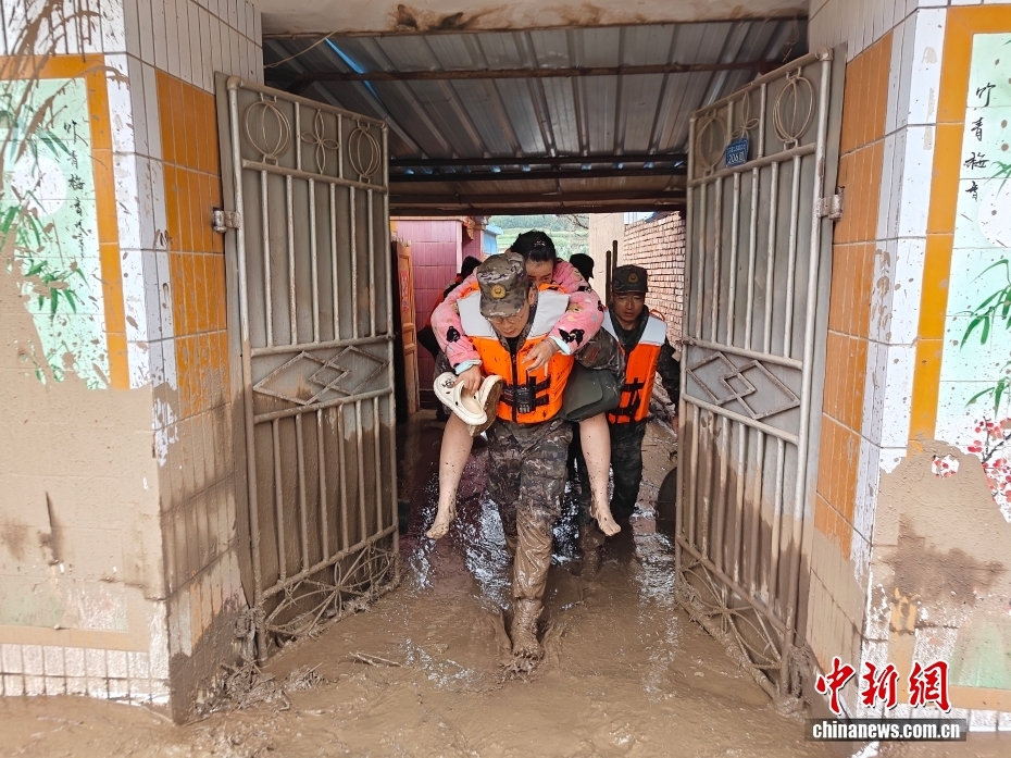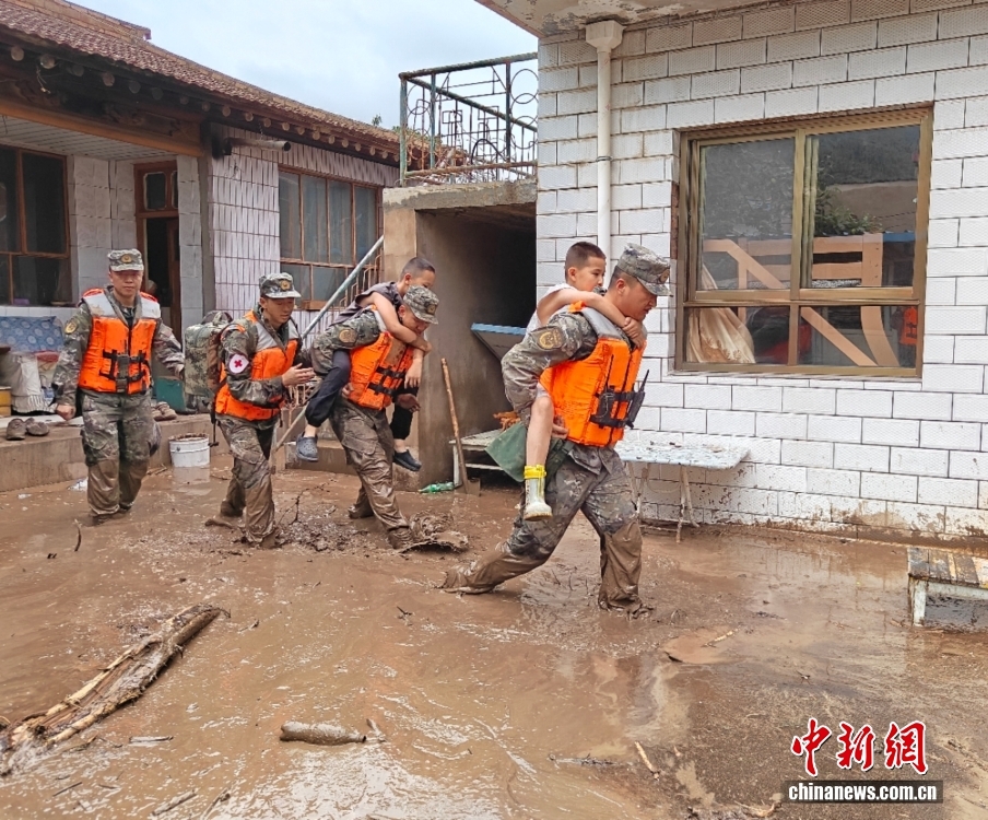 8月8日,武警甘肅總隊機(jī)動支隊官兵在甘肅省蘭州市榆中縣興隆山村轉(zhuǎn)移被困群眾。劉昆 攝