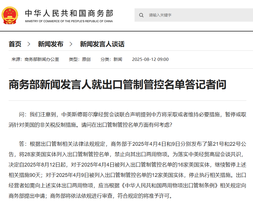 答:根據(jù)出口管制相關(guān)法律法規(guī)規(guī)定,商務(wù)部于2025年4月4日和9日分別發(fā)布了第21號和22號公告,將28家美國實(shí)體列入出口管制管控名單,禁止向其出口兩用物項(xiàng)。為落實(shí)中美經(jīng)貿(mào)高層會談共識,決定自2025年8月12日起,對于2025年4月4日被列入出口管制管控名單的16家美國實(shí)體,繼續(xù)暫停上述相關(guān)措施90天;對于2025年4月9日被列入出口管制管控名單的12家美國實(shí)體,停止執(zhí)行相關(guān)措施。出口經(jīng)營者如需向上述實(shí)體出口兩用物項(xiàng),應(yīng)當(dāng)根據(jù)《中華人民共和國兩用物項(xiàng)出口管制條例》相關(guān)規(guī)定向商務(wù)部提出申請;商務(wù)部將依法依規(guī)進(jìn)行審查,符合規(guī)定的將準(zhǔn)予許可。