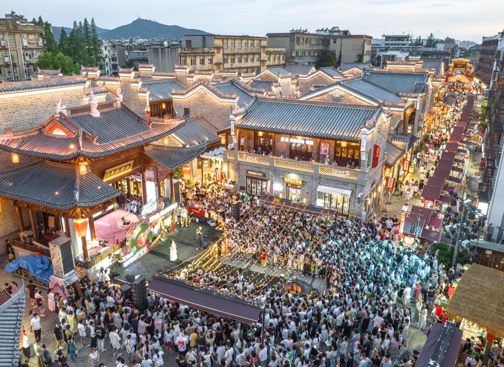 7月25日,游客在湖北省襄陽古城管家巷文化休閑街區(qū)觀看星光音樂會(無人機照片)。新華社發(fā)(楊東攝)