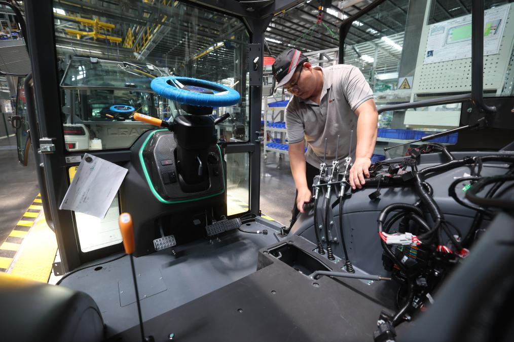 7月27日,工人在山東省臨沂市蘭山區(qū)臨工智慧農(nóng)機裝備產(chǎn)業(yè)園的流水線上組裝拖拉機。新華社發(fā)(王彥冰攝)