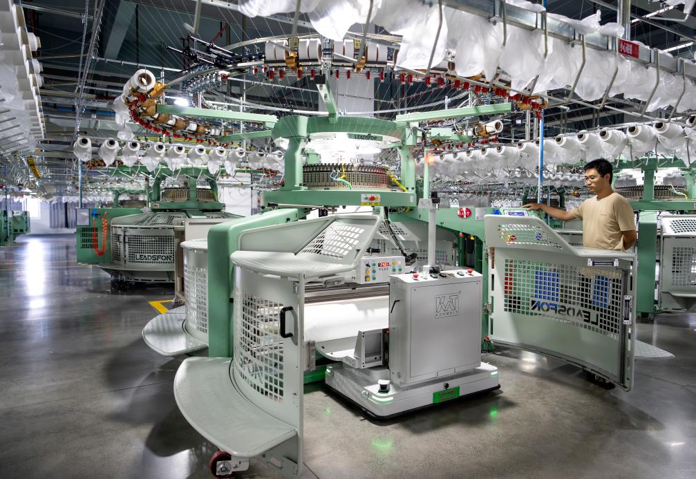 7月24日,一名工人在泉州聯(lián)興發(fā)針織織造有限公司的萊卡+5G智能數(shù)字化生產(chǎn)車間操控機器人工作。新華社記者 魏培全 攝