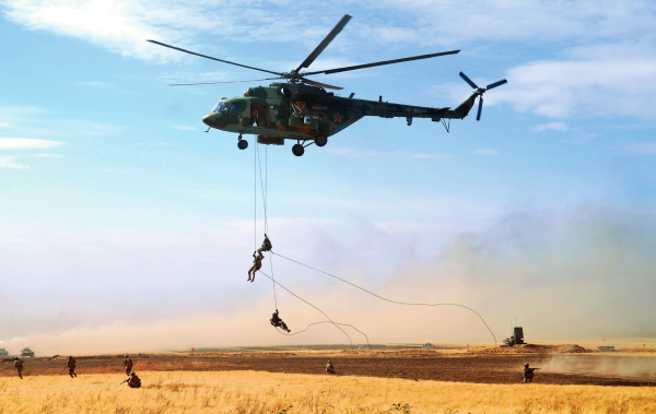 在俄羅斯奧倫堡州東古茲靶場舉行的“和平使命-2021”上海合作組織聯(lián)合反恐軍事演習(xí)實(shí)兵實(shí)彈演習(xí)中,多國聯(lián)合部隊(duì)特戰(zhàn)分隊(duì)執(zhí)行索降作戰(zhàn)任務(wù)(資料照片)梅世雄攝 / 本刊