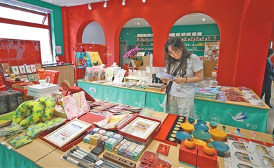 游客在北京地安門主題郵局選購(gòu)文創(chuàng)產(chǎn)品。