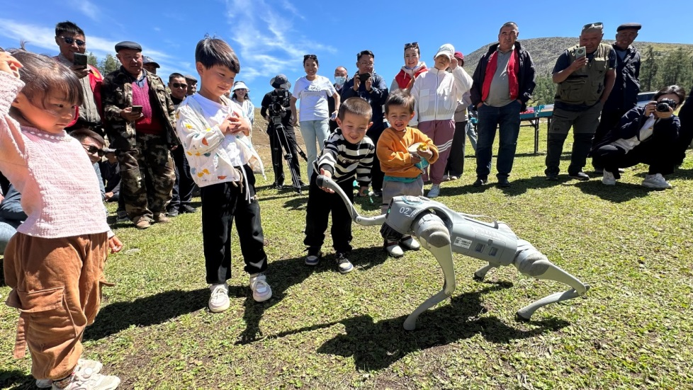 科普大篷車開進(jìn)新疆阿勒泰青河縣套查干湖夏牧場,當(dāng)?shù)匦∨笥押蜋C器狗互動。(新疆科技館供圖)