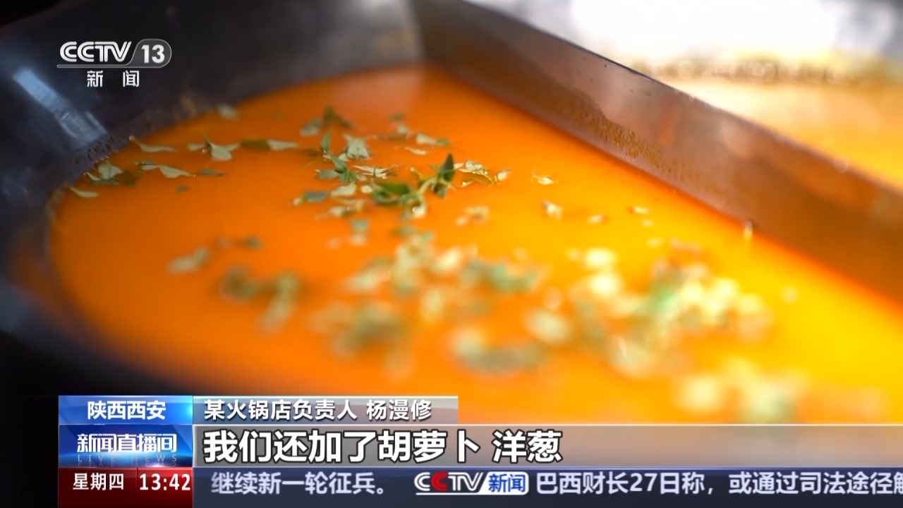 某火鍋店負(fù)責(zé)人 楊漫修:我們這個番茄鍋更像是西餐里面的番茄濃湯,比如說我們在做料的時候除了番茄以外,我們還加了胡蘿卜、洋蔥、歐芹、百里香。