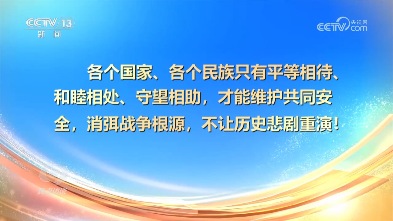 央視網(wǎng)消息(焦點訪談):9月3日上午,紀(jì)念中國人民抗日戰(zhàn)爭暨世界反法西斯戰(zhàn)爭勝利80周年大會在北京隆重舉行。我們以盛大閱兵儀式,同世界人民一道紀(jì)念這個偉大的日子。同日,紀(jì)念中國人民抗日戰(zhàn)爭暨世界反法西斯戰(zhàn)爭勝利80周年招待會在人民大會堂隆重舉行。在這些紀(jì)念活動中,習(xí)近平總書記發(fā)表一系列重要講話,強調(diào)要銘記歷史、緬懷先烈、珍愛和平、開創(chuàng)未來。