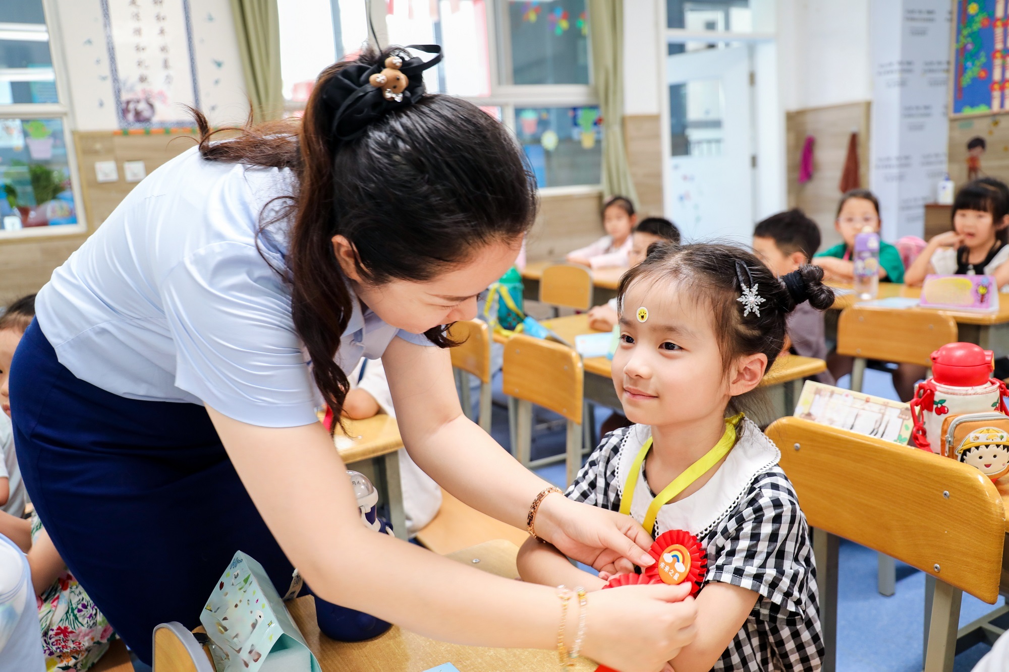 老師為新生帶上獎(jiǎng)勵(lì)的“小勛章”(央廣網(wǎng)發(fā) 西安高新第八小學(xué)供圖)