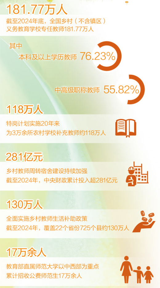 這是真金白銀的投入。2024年,特崗教師工資性補(bǔ)助再次提標(biāo),每人每年增加3600元;鄉(xiāng)村教師生活補(bǔ)助政策深入實(shí)施,受益教師約130萬人,人均月補(bǔ)助金額約400元;鄉(xiāng)村教師周轉(zhuǎn)宿舍建設(shè)持續(xù)加強(qiáng),中央財政累計投入超281億元,建設(shè)約63.7萬套。