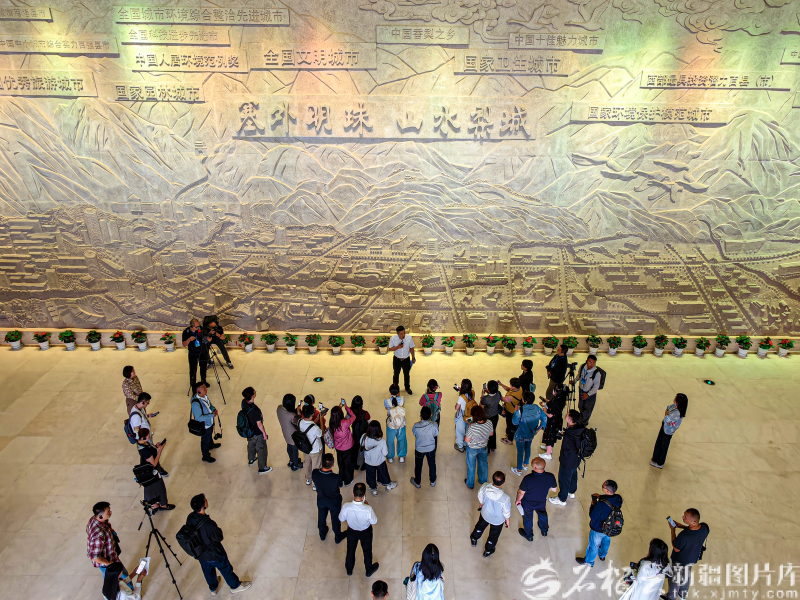 9月8日,在巴州鑄牢中華民族共同體意識主題展館,采訪團拍攝南疆火車通車雕塑。