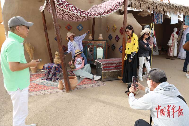 9月9日,新疆巴州尉犁縣羅布人村寨景區(qū),游客以廣袤的塔克拉瑪干沙漠為背景拍照留念。中青報(bào)·中青網(wǎng)記者 王鑫昕/攝