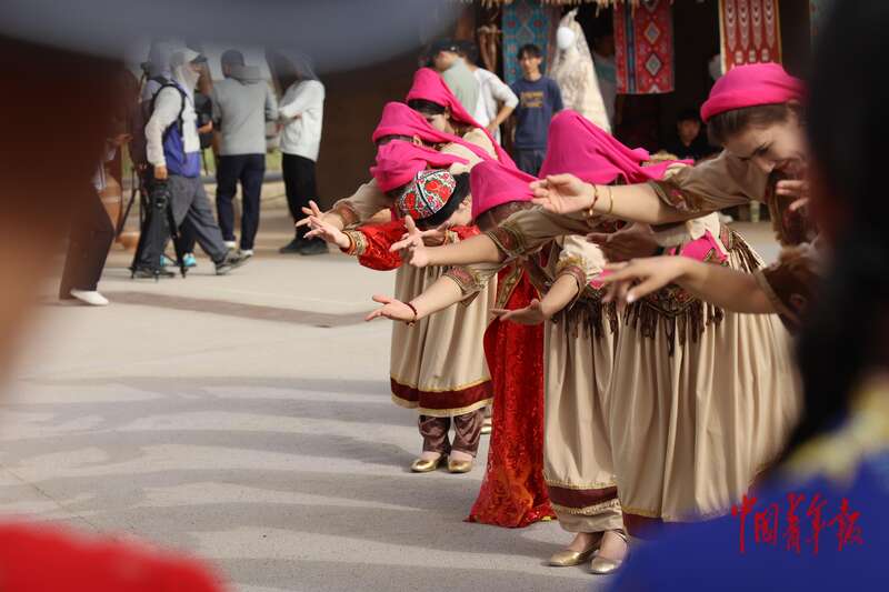 9月9日,新疆巴州尉犁縣羅布人村寨景區(qū),一場(chǎng)演出結(jié)束后,演員們向游客鞠躬致意。中青報(bào)·中青網(wǎng)記者 王鑫昕/攝