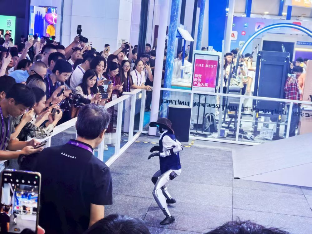 在東博會宇樹科技展位,機(jī)器人在表演熱舞。新華社記者王楚然 攝