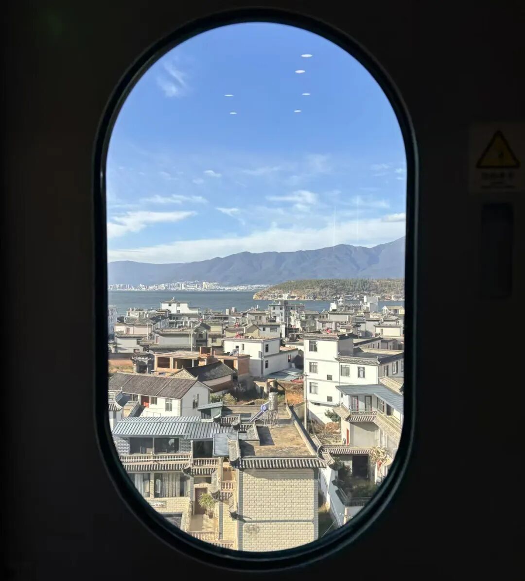 列車載著風(fēng)穿行,車窗恰似畫框,將大理的詩意牢牢框住。澄澈藍(lán)天如被水洗過的藍(lán)綢,洱海似一汪碎了的藍(lán)寶石,在日光下漾著粼粼波光,遠(yuǎn)處青山如黛,靜默相依。近處,白墻黛瓦的村落像從時光深處走來的精靈,挨挨擠擠。屋頂?shù)木€條或平直或微翹,似在無聲訴說著歲月故事。隔著車窗,也能感受到“詩和遠(yuǎn)方”,真叫人沉醉在這旅途中的“大理藍(lán)”里。(作者:李婭姣)